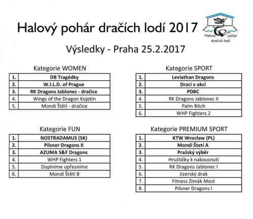 Halový pohár dračích lodí je již tak tradiční akce, že si bez ní zimu ani nedovedeme představit. Proto už nyní pilně trénujte, abychom mohli po novém roce změřit síly. Opět svedeme boj do posledního metru, potopíme nějakou loď i s posádkou a především zabojujeme o tituly Halového Mistra České republiky na dračích lodích 2018 a Halové Mistryně České republiky na dračích lodích 2018.